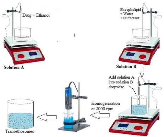 Liposomes are added with edge activators and permeation enhancers to form transethosomes (TELs) to permeate the drug via the stratum corneum. It has been observed that drugs entrapped in TELs are released in a controlled manner. TELs have a high entrapment efficiency due to the biodegradable and biocompatible nature of surfactants. TELs can entrap both low and high molecular weight drugs. Phospholipids and surfactants are used as a carrier for delivering drugs via the skin. They can easily interact with the stratum corneum, improve tissue hydration, and merge with lipids of the stratum corneum. They contain a hydrophilic (polar) head and a hydrophobic (nonpolar) tail. Biocompatible surfactant is a bilayer softening agent that increases flexibility and permeability. When alcohol and the surfactant are combined, it leads to a rearrangement of the lipid bilayer and becomes more deformable such that the deeper penetration into the dermis becomes more feasible. Furthermore, TELs can be transformed into a gel for ease of topical application. The TELs are prepared by the mechanical dispersion technique and the hot and cold method. The mechanical dispersion technique can be utilized by mixing chloroform and ethanol in a round bottom flask followed by the addition of phospholipid. The solvent is removed by using a rotary evaporator. The thin lipid film is deposited on the top of a round bottom flask and then the thin film is hydrated. In the hot method, phospholipids are dispersed in water at 40 °C until a colloidal solution is formed. In the second step, ethanol, surfactant, cholesterol, and propylene glycol are mixed in another vessel at 40 °C. Finally, the organic phase is added to the liquid phase and stirred for 10 min. The formulation is dried by lyophilization. In the cold method, the phospholipid, cholesterol, surfactant, and drug are added to ethanol, followed by the addition of propylene glycol. The aqueous phase is added dropwise at 30 °C and stirred and homogenized to obtain transethosomal dispersion. The transethosomal gel can be prepared by adding transethosomal dispersion in a foe prepared gel of carbopol 940 to enhance the permeation as well as efficacy at the target site [,,].