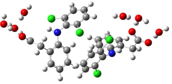 The structure, IR, and Raman spectra of the hydrated diclofenac monomer and its dimer were computed at the B3LYP-D3/6-311++G** and wB97XD/cc-PVTZ levels using Gaussian 16 software package (Gaussian, Inc., Wallingford, CT, USA) [91]. The London dispersion interactions were taken into account by introducing the D3 correction developed by Grimme et al. [92]. The scaled factors [93] were not used. The PCM model was applied to simulate water medium [94].