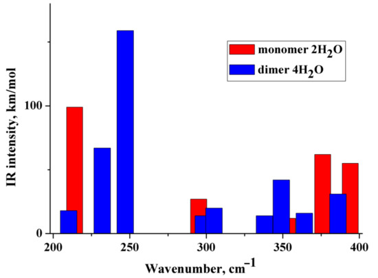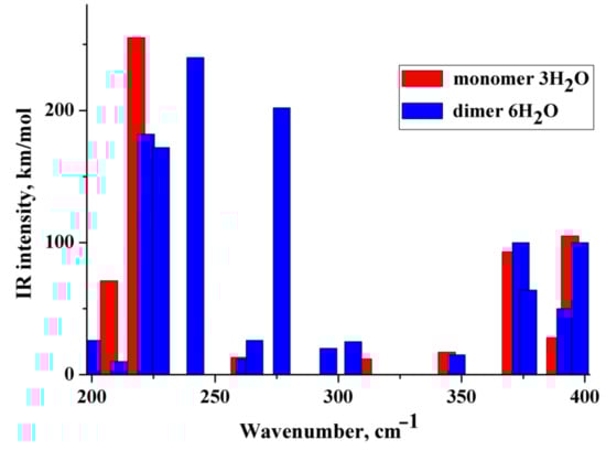 (i) The IR and Raman spectra of an anion hydrated with two and three water molecules (monomer) are practically the same. A similar situation is observed for the hydrated dimer of the diclofenac anion. (ii) Wavenumbers of IR and Raman intense vibrations of monomer and dimer practically do not differ from each other; the only exception is the region of 200–300 cm−1. In this region, the wavenumbers of IR-active vibrations of the dimer and monomer differ significantly (Figure 3 and Figure 4). The IR-intense band of the dimer at about 245 cm−1 is due to torsion vibrations of water in the hydration shell (Figure 5 and Figure 6). Its wavenumber is practically the same for the dimer hydrated by four and six water molecules.