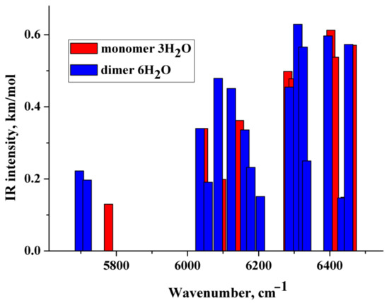 The near-infrared spectrum in the region of the first stretching overtone of water O−H groups was evaluated using the freq = (Anharmonic,SelectAnharmonicModes) option [91]. For differentiation in anharmonic analysis, all O-H stretch modes of water molecules of the considered hydrate complex were used.