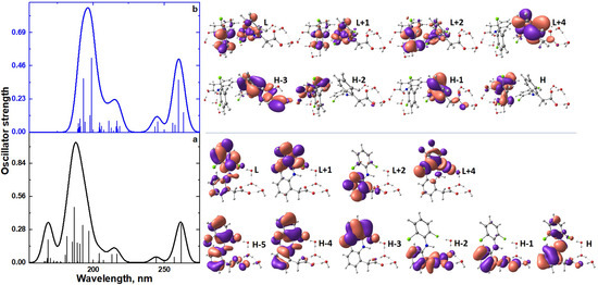 TDDFT spectra of monomer (anion diclofenac·3H2O) (a) and its dimer (b); the view of frontier molecular orbitals of monomer (anion diclofenac·3H2O) and its dimer.
