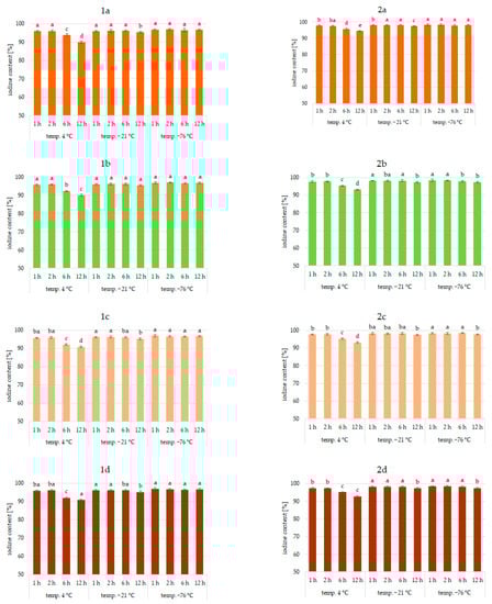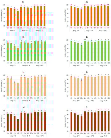 Iodine content (%) in pumpkin (1a,2a), broccoli (1b,2b), cauliflower (1c,2c), and carrot (1d,2d) fortified with KI and KIO3, respectively, at hydration ratio 1:2 and different temperatures (4 °C, −21 °C, −76 °C) and times; different letters (a–g) denote a significant difference at p < 0.05 (one-way ANOVA, and post hoc Tukey test). Mean values (n = 4). Error bars are confidence intervals with a confidence coefficient of 0.95.