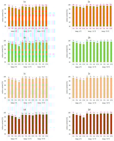 Iodine content (%) in pumpkin (1a,2a), broccoli (1b,2b), cauliflower (1c,2c), and carrot (1d,2d) fortified with KI and KIO3, respectively, at hydration ratio 1:1 and different temperatures (4 °C, −21 °C, −76 °C) and times; different letters (a–e) denote a significant difference at p < 0.05 (one-way ANOVA, and post hoc Tukey test). Mean values (n = 4). Error bars are confidence intervals with a confi-dence coefficient of 0.95.