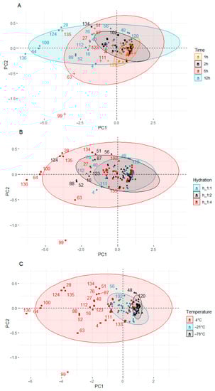 Principal component analysis (PCA) was applied to observe possible clusters in fortified pumpkin, broccoli, cauliflower, and carrot prepared at different times, hydration degrees, and temperatures. The result of the distribution of the samples depending on the differentiating factor (time, hydration degree, and temperature) is shown in Figure 4.