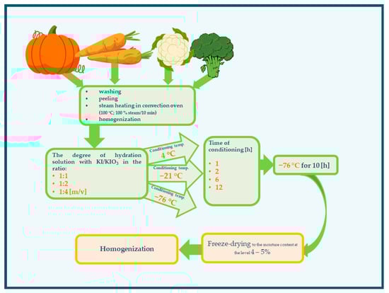 The experimental scheme is presented in Figure 5. The vegetables were washed under running tap water. The pumpkin and carrot were peeled with knives, and the seeds of the pumpkin were removed. The vegetables were cut into small pieces: pumpkins into cubes in size about 4 × 4 × 4 cm, carrots in slices 4 cm thick, and cauliflower and broccoli in florets. Next, the vegetables were steamed (100 °C; 100% steam/10 min) in a convection oven (Rational, Landsberg am Lech, Germany). The vegetables were subsequently drained and subjected to homogenization (homogenizer—Foss, Hilleroed, Denmark) to obtain a particle size of 250 µm. The next stage of impregnation was the conditioning of the vegetables in an aqueous solution of KI/KIO3 (Table 3). For the next impregnation steps, the variability of conditions was assumed: