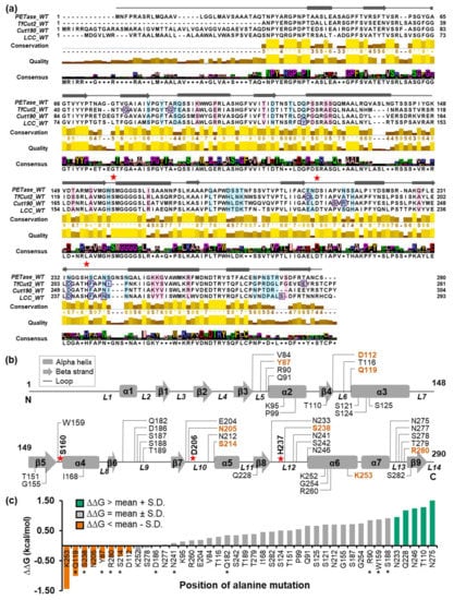 MSA of PET-degrading enzymes and the free binding energy of the PETase-PET complex. (a) Amino acid sequences of four PET-degrading enzymes were aligned. The PETase secondary structure elements were indicated in the top panel with a gray rectangle and arrow for α-helix and β-sheet, respectively. Amino acid sequences with low conservation scores were highlighted with blue and pink boxes for the loop and the non-loop region residues. Reported amino acid sites for mutagenesis were in purple boxes. The conservation, quality, and consensus were illustrated at the bottom. (b) The positions of 42 selected amino-acid residues of PETase were indicated in the secondary structure. (c) The bar graph showed the relation between the ∆∆G of each PETase variant-PET complex and the position of alanine mutation. The conformation of the PET substrate (2-HE(MHET)4) binding to PETase was selected to determine ∆G, which was then compared with that of the WT PETase, ∆∆G. The asterisks specify the validated residue in the previous studies, Figure S7. (a,b) The S–D–H catalytic triad was marked as red five-pointed stars. (b,c) The eight selected amino acid residues were highlighted in orange.