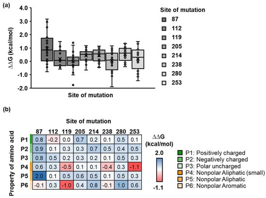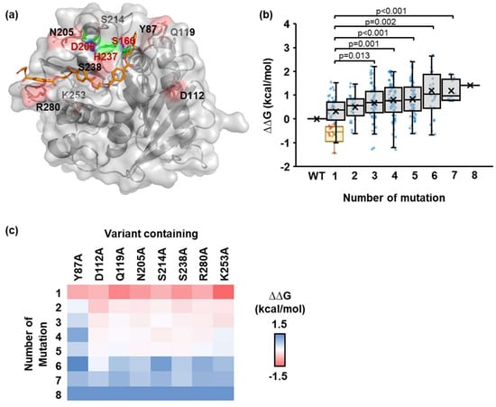 The specific sites that have a significant impact on the docking score differ depending on the number of mutation sites. We discovered that K253A variants had the lowest ∆∆G for a single mutation site (Figure 2c). In the case of two-mutation-site variants, a group of variants containing either D112A or S238A had the lowest overall ∆∆G (Figure 2c and Figure S2c). These findings suggested that combining multiple low ∆∆G single-mutation sites does not always yield the desired low ∆∆G variants. Here, the variants with an alanine substitution at position 112 appeared to have the lowest ∆∆G, while variants with an alanine substitution at position 87 appeared to have the highest ∆∆G (Figure 2c).