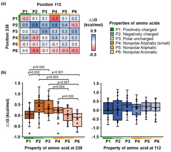 Double site-saturation mutagenesis of PETase on positions 112 and 238. (a) The color map illustrated the ∆∆G distribution as a function of the physicochemical properties of side chains (P1–P6 described in the legend) at positions 112 and 238 of PETase. (b) The boxplot showed the ∆∆G distribution of the PETase variant and PET substrate complex with respect to the WT PETase. An individual box represented different physicochemical properties of amino acids (P1–P6) at position 238 (left) and position 112 (right). The dots presented the ∆∆G of an individual PETase variant containing random mutagenesis at position 112 (left) and 238 (right). (Unpaired two-tailed Student’s t-test. Left: p values are indicated in the graph. Right: No significant difference at p < 0.05).