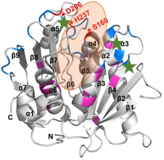 Three-dimensional ribbon representation of the WT PETase. A PETase enzyme displayed the nomenclature for N-terminus (N), C-terminus (C), all alpha helices (α1–α7), and all beta strands (β1–β9). Catalytic residues (S160, D206, and H237), and the selected mutated residues 112, 119, and 238, were denoted by red and green stars, respectively. The orange shadow represented the binding pocket. Amino acid sequences in the loop or non-loop regions were highlighted with blue or pink (related to Figure 1a).