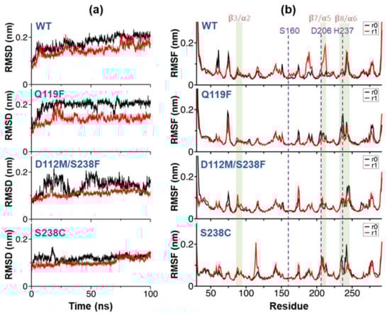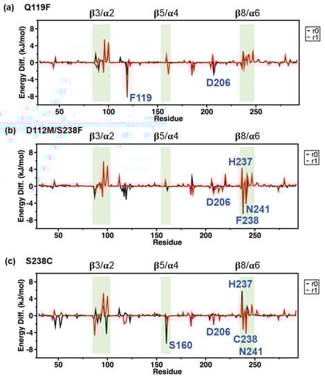 Peaks of MM/PBSA binding energy gain at F119 residue were observed in Figure 8a for both Q119F-r0 and Q119F-r1 replicas, which corresponded to the previously mentioned extra hydrophobicity. A small binding energy gain was observed near the D206 active residue, but a relatively large binding energy loss within the β3/α2 and β8/α6 loops contributed to a weaker overall binding free energy than WT. The hydrophobic substitution S238F resulted in a significant energy gain at F238 and N241, but binding energy loss at the catalytic site H237, indicating a shift of binding positions away from the catalytic sites for the D112M/S238F variant in Figure 8b. Binding energy loss within the β3/α2 loop was also observed for the D112M/S238F variant, which contributed to a lower overall binding free energy than the WT. The S238C variant’s MM/PBSA binding energy gain profile in Figure 8c showed a unique binding energy gain peak at catalytic site S160, as well as other binding energy gain/loss peaks with similar characteristics to other variants.