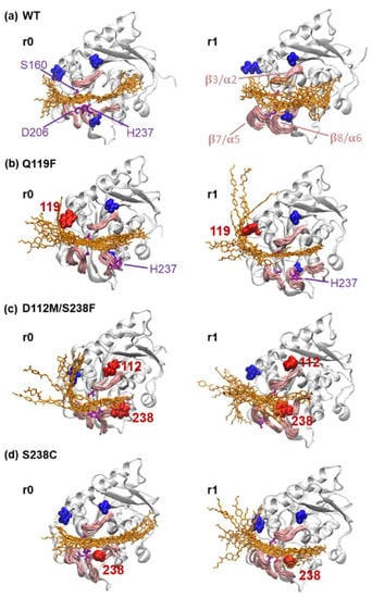 Conformational snapshots of the PETase and PET complex. Three-dimensional ribbon representation of the (a) WT PETase and its three mutants, (b) Q119F, (c) D112M/S238F, and (d) S238C, along with the superimposed snapshots taken between 50–100 ns of the tetra-PET substrates (orange), unmutated residues 112/119/237 (blue), and mutated residues 112/119/238 (red). Other important residues and regions were labeled within this figure. Two replicas “r0” (left) and “r1” (right) from each protein structure were presented.