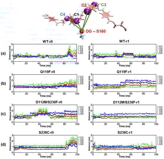 The S160 amino acid residue was important in the hydrolysis of PET substrates because it transferred an electron from its side chain hydroxyl oxygen atom (OG) to a carbon atom within a PET carbonyl (C=O) group [23]. As a result, throughout the simulations, the distances between the OG of S160 and four carbon atoms from four middle carbonyl groups of the modelled tetra-PET substrate were measured (Figure 9a–d and Figure S6). The distances between OG and the two center-most carbon atoms (C1 and C2) of the carbonyl groups were minimal at the start of each simulation, which corresponded to the docking results. The substrate slid along the binding cleft when either C3 or C4 became closest to the OG of S160. Substrate sliding was observed in the Q119F-r1 and D112M/S238F-r0 simulations where C4 was moved further away from the S160 residue. Meanwhile, in both S238C simulations with an additional contribution of S160 to the MM/PBSA binding energy, C1 and C2 remained the closest atoms to the OG atom of S160, possibly facilitating electron transfer.
