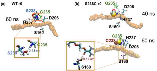 Selected conformational snapshots from the WT-r0 and S238C-r0 were shown in Figure 10a,b to further investigate the effects of the S238C mutation, which caused binding pocket narrowing and an extra hydrogen bonding at S160. Snapshots of catalytic residues, mutated residues, substrate, and the residue G235 were chosen from 40 ns and 60 ns before and after the binding mode transition of the S238C-r0 replica, respectively. The native S238 residue formed a hydrogen bond with the backbone of G235 in the WT complex (Figure 10a). When the residue 238 in Figure 10b was mutated into C238, the mutated residue 238 lost its hydrogen bond with G235 and became bound to the substrate instead. The S238C mutation involved only changing an O atom into an S atom, which decreased the polarity of the side chain and increased van der Waals contacts with the substrate due to a larger van der Waals radius of an S atom than that of an O atom.