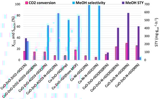 Impregnation of graphene derivatives (GO, rGO or N-rGO) with Cu(NO3)2 and Zn(NO3)2, followed by calcination in air was used to prepare CuO-ZnO-rGO(3D) [24], and CuO-ZnO-N-rGO with bidimensional (2D) [26,27], or three-dimensional (3D) [29] structure. The same impregnation method was used to prepare Cu-ZnO-rGO, but in this case, in order to obtain the copper reduction in the presence of graphene, the calcination was performed in nitrogen at 800 °C [25]. By impregnation of rGO and N-rGO with Cu(NO3)2 and Ni(NO3)2, followed by the reduction in (H2 + N2) (5%H2), at 300 °C, a bimetallic Cu-Ni catalyst, with no ZnO, was prepared [33]. The reduction temperature is too low to reduce Ni, or even to fully reduce Cu, therefore the resulting catalyst is a mixture of metallic and oxidic Cu and Ni deposited on the reduced graphene oxide support. For this unusual catalyst, CO2 conversion at medium temperatures (225 °C) and high pressures (40 bar) was low, but methanol selectivity is among the highest reported up to now (Figure 2).