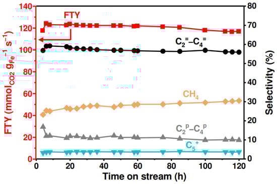 FTY and hydrocarbons selectivity in CO2−FTO over the FeK(1.5)/Gr(3D) catalyst (0.15 g catalyst, H2/CO2 = 3, T = 340 °C, p = 20 bar, space velocity of 26 L h−1 g−1) (reprinted with permission from Ref. [45] © 2018, American Chemical Society Inc., Washington, DC, USA).