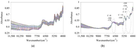 Near-infrared spectroscopy (NIRS) has the advantages of enabling rapid, simple, and nondestructive analyses, and it has been widely used in quantitative analysis (QA) and qualitative analysis of agricultural products and wastes [8]. NIRS mainly records the frequency overtone and absorption combination of a hydrogen-containing group’s vibrations [9]. The absorption wavelengths and intensities for different groups or for the same group are different in different chemical environments. Therefore, NIRS is well suited to measuring the composition of hydrocarbon organic substances [10]. However, there are some problems regarding NIRS, such as wide peak width, serious overlapping, and poor spectral interpretation, and therefore it is necessary to use chemometrics methods for QA [11]. Cellulose and hemicellulose contain many hydrogen-containing groups (C–H, –OH, etc.), which are suitable for constructing qualitative and quantitative detection models using NIRS combined with chemometrics [12].