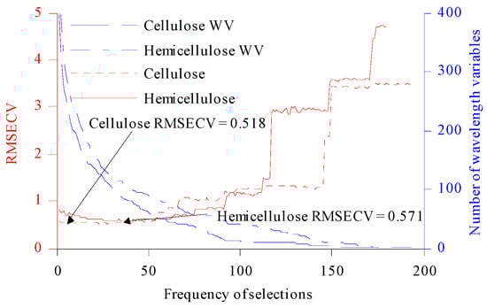 According to the minimum RMSECV (cellulose: 0.518; hemicellulose: 0.571), the corresponding CWVs were selected [7]. A total of 241 CWVs were selected for cellulose, and 106 CWVs were selected for hemicellulose. In the third-order overtone band range of the –OH group, 98 CWVs were selected for cellulose and 32 CWVs were selected for hemicellulose. In the second-order overtone band range of C–H, and –CH2 groups, 63 CWVs were selected for cellulose and 32 CWVs were selected for hemicellulose. In the range of the first-order overtone band range of C=O and –OH groups, 30 CWVs were selected for cellulose and 13 CWVs were selected for hemicellulose. In the combined frequency range of C=O, –OH and C–C groups, 50 CWVs were selected for cellulose and 29 CWVs were selected for hemicellulose [33].