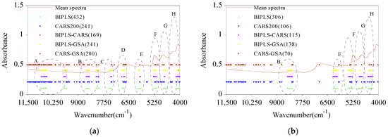 The characteristic wavelength variable distributions of cellulose (a) and hemicellulose (b) optimized by BIPLS, CARS200, BIPLS-CARS, BIPLS-GSA, and CARS-GSA.