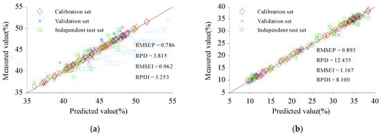 Prediction scatter plot for cellulose (a) and hemicellulose (b). RMSEI and RPDI represent the RMSE and RPD of the independent test set, respectively.