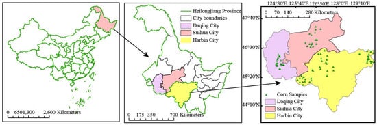 CS samples were collected from Daqing, Harbin, and Suihua, Heilongjiang Province, China. The distribution of the sampling locations is shown in Figure 7. Surface impurities were removed from the collected CS with distilled water, and the samples were placed in an open and ventilated place for natural air-drying and then mechanically pulverized. After drying at a constant temperature in a drying oven at 40 °C for 48 h, all samples were pulverized using an FZ102 mill (Taisite, Tianjin, China), filtered through a 40 mesh vibrating screen, and marked and saved in sealed bags. A total of 184 samples were collected. The contents of C and H were measured using the Van Soest method [39]. An ANKOM 200i fiber analyzer (ANKOM Tech., New York, NY, USA) was used to measure the contents of neutral detergent fiber (NDF) and acid detergent fiber (ADF) in the sample powder [40]. The content of acid detergent lignin (ADL) was measured using the 72% sulfuric acid hydrolysis method [41]. The calculation methods for the C and H contents used NDF and ADF, and ADF and ADL, respectively.