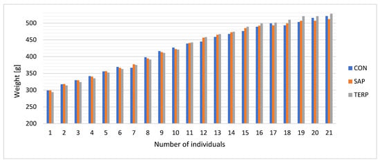 The initial body weight, the final body weight, and the food intake (Table 4) did not change between the groups. However, a tendency toward decreased body weight after the application of the terpenoid fraction was observed only at the final stage of the experiment. The dynamics of the changes in body weight during the supplementation period are presented in Figure 1. Feed intake in rats with metabolic syndrome affected liver weight, which was highest in the TERP group and lowest in SAP. These differences were not statistically confirmed. In another study, a hypercholesterolemic diet was shown to affect body weight []. Conversely, changes in adipose tissue stores may affect the expression of genes responsible for the synthesis of lipolytic hormones and trigger mechanisms related to cholesterol and free fatty acid levels. This has also been confirmed in our own studies. Obese Zucker rats had significantly higher body and organ weights and plasma levels of TNF-α, insulin, and leptin than lean animals []. Our own research suggests that these changes may be partially ameliorated by the use of saponins, especially with regard to body weight.