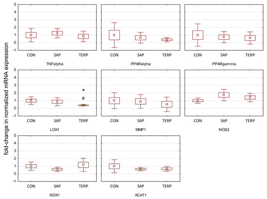 Expression of genes after treatment of saponin and terpenoid fraction in Zucker rat aorta. CON, control group; SAP, rats fed a standard diet with the addition of saponin fraction; TERP, rats fed a standard diet with the addition of terpenoid fraction. Values were normalized against Gapdh expression and presented as a fold-change in relation to gene expression in a control group. Specific comparisons: * p < 0.05 vs. CON; # p < 0.05 vs. SAP (ANOVA followed by the post hoc test). TNFα, tumor necrosis factor alpha; PPARα, peroxisome proliferator-activated receptor alpha; PPARγ, peroxisome proliferator-activated receptor gamma; LOX1, lectin-type oxidized LDL receptor; MMP1, matrix metalloproteinase-1; NOS3, nitric oxide synthase 3; NOX1, NADPH oxidase 1; ACAT1, acetyl-CoA acetyltransferase 1.