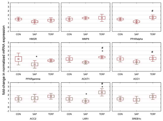 Expression of genes after treatment of saponin and terpenoid fraction in Zucker rat liver. CON, control group; SAP, rats fed a standard diet with the addition of saponin fraction; TERP, rats fed a standard diet with the addition of terpenoid fraction. Values were normalized against Gapdh expression and presented as a fold-change in relation to gene expression in a control group. Specific comparisons: * p < 0.05 vs. CON; # p < 0.05 vs. SAP (ANOVA followed by the post hoc test). HMGR, 3-hydroxy-3-methyl-glutaryl-coenzyme A reductase; MMP9, matrix metallopeptidase 9; PPARalpha, peroxisome proliferator-activated receptor alpha; PPARγ, peroxisome proliferator-activated receptor gamma; ACAT1, acetyl-CoA acetyltransferase 1; ACC1, acetyl-CoA carboxylase 1; ACC2, acetyl-CoA carboxylase 2; LXR1, liver X receptor; SREB1c, sterol regulatory element-binding protein 1.