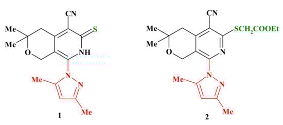 The structure of starting pyrazol-1-yl-substituted thioxopyrano[3,4-c]pyridine 1 and ethyl thioacetatepyrano[3,4-c]pyridine 2.
