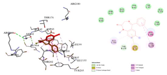 Compounds 3b, 3f, 4a and 4e do not bind to this receptor. Complexation is observed both in the active center of the protein and in allosteric sites, which are evidenced by the obtained spatial interaction parameters. Energy values of complexation were calculated for seven compounds. The lowest binding energy was found for compounds 3c and 4b, followed by 3d, but compound 3a had the highest binding energy (Table 7). The mean square deviation during the complexation did not exceed RMSD ≤ 2 Å. Obtaining the spatial parameters of complexation is evidence that all the investigated compounds bind to the ligand binding domain in two basic sites of the protein. A conformational map of the binding of diazepam to GABAA indicates that the amino acid residues Phe200, Tyr205, Ala201, Tyr 97, Glu155 and Tyr202 in chain C and Asp 43, Tyr176, Tyr66, Asn41, Gln64 and Tyr 62 in chain B are involved in the complexation process (Figure 2).
