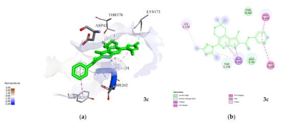 In the case of 3c, the hydrogen bonds were not detected at the interaction. The interaction is carried out at the expense of electrostatic and hydrophobic interactions (Figure 4).