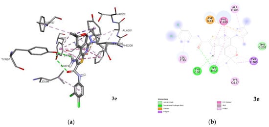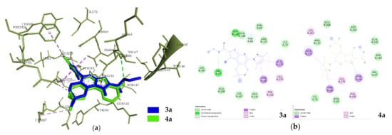 Visualization of the interaction of 3e with GABAA; (a) spatial orientation and character of the interaction; (b) conformational map of complexation. Green lines are hydrogen bonds, orange—electrostatic and violet−hydrophobic interactions.