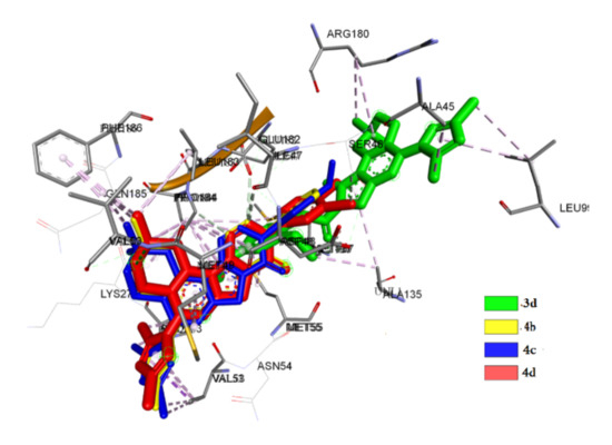 The spatial orientation of 4b is different from position 3d, with a deviation of 5.8 Å, herewith there is observed a hydrogen bond with Val 50, linked by the binding site of the subsite 3. Compound 4b binds with Met137 from the key residues and exhibits electrostatic and hydrophobic interaction with Glu182. Despite the absence of hydrogen bonds with the key residues of subsite 3, the advantage of 4b is obvious compared to 3d in terms of spatial-energy characteristics.