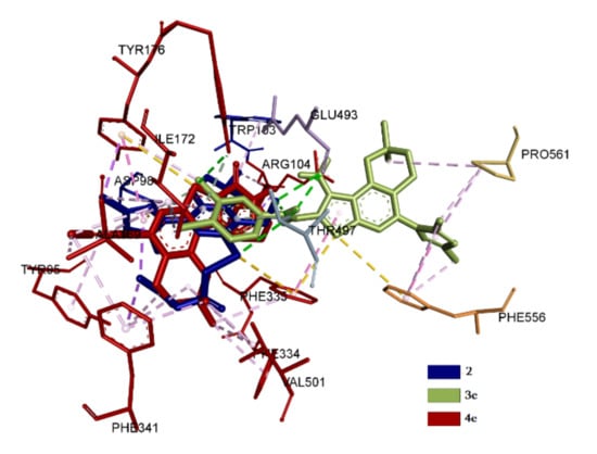 Obtained spatial and conformation parameters of complexation are evidence that the studied compounds’ positions can be divided into two classes. The first class includes compounds for which binding occurs especially at the central site of the active center of SERT [43], such as 2, 3e and 4e. The second class is formed by compounds that bind predominantly in the allosteric site [44], such as 3c, 3d, 3f, 4b and 4d. Compounds that bind at the central site of SERT exhibit different energy indices and binding constants. Compound 4e possesses the highest values, with the involvement of key amino acid residues Ile172, Tyr176, Phe335, Tyr95, Phe341 and Val501 [45]. The spatial arrangement of 2 corresponds to the position of 4e with a deviation at a38° angle. At the same time, the amino acid residues involved in the process of complexation correspond to each other with a difference of just one residue. Compound 2, instead of Val501, has Tyr497, which is also included in the central site [46]. The conformational maps of complexation obtained indicate that interactions carried out by hydrogen bonds and electrostatic forces. Hydrophobic interactions are also involved in the complexation. In compound 2, the hydrogen bonds are formed with two residues, the Tyr497 and Glu 493, which do not reach the central binding site with distances of 3.3 and 3.0 Å, respectively. In 4e one hydrogen bond is visualized with Tyr175, which is not included in the active site. It should be noted that the interaction of 4e in the central site of the active center is predominantly carried out due to electrostatic and hydrophobic forces. The basically spatial position of 3e is different from the rest of other members of the group. The quantity of amino acid residues involved in the complexation is less than that of 2 and 4e. Compound 3e interacts with Ile172, Tyr176, Phe335 and Tyr497 and formed a hydrogen bond with Tyr497 with a distance of 3.0 Å. In other cases, hydrophobic interaction predominates. It should be noted that 3e also interacts hydrophobically with the amino acid residues Phe556 and Pro561 of the allosteric site [47]. Single hydrophobic interactions with Arg104 are also observed in 2 and 4e. The results of superposition of 2, 3e and 4e in the central site are presented in Figure 7.