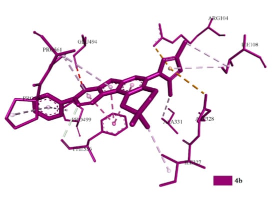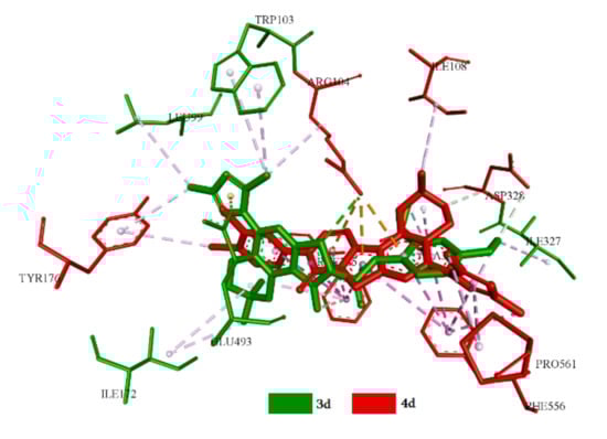 The positions in the allosteric site of the best conformers of the first subclass are located mirrored relative to each other. The difference of root-mean-square deviation (RMSD) is 0.5 Å with an angle of 36°. Amino acid residues Arg104, Asp328, Ala331 and Phe556 are included in the complexation for both representatives of this subclass. The interactions are carried out at the expense of hydrophobic interaction. Apart from that, hydrophobic interaction of Phe335 and Tyr176 with the central binding site is observed in 4d, and in 3d, it is observed forTyr176 and Ile172 (Figure 10).