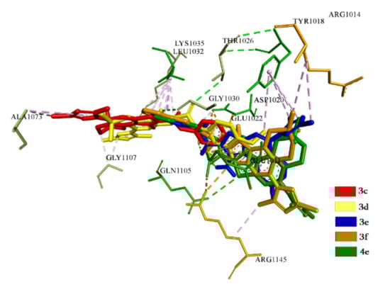 For compounds included in the second cluster, the interactions in the T4L domain are carried out basically due to hydrophobic force with the involvement of amino acid residues Glu1011 and Leu1032. It should be noted that compound 3f forms ahydrogen bond with Glu1011 with a distance of 3.2 Å. All compounds also interact with Asp1020 due to hydrophobic forces, except for3e. In the same way, interactions are observed with Tyr1018, except for 3c. Compounds 3e and 3f form hydrophobic bonds with Arg1014 and Glu1022 (Figure 12).