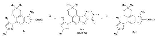 The newly synthesized 1-amino-N-alkyl(aryl)-5-pyrazol-1-yl-pyrano[4,3-d] thieno[2,3-b]pyridines 3a,c–f still contain amino and carboxy functional groups which can undergo new cyclization reactions. Thus, by interaction of compound 3a with formamide pyrano[4″,3″:4′,5′]pyrido[3′,2′:4,5]thieno[3,2-d]pyrimidin-8-one, 4a was synthesized. By condensation of compounds 3c–f with triethylorthoformate in the presence of acetic anhydride, new derivatives of pyrano[4″,3″:4′,5′]pyrido[3′,2′:4,5]thieno[3,2-d] pyrimidin-8-ones 4b–e were synthesized with high yields (Scheme 2, Table 2).