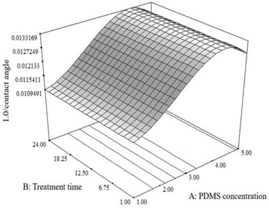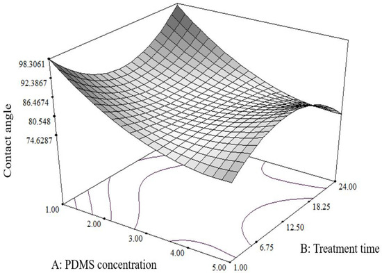 Response surface plot of PDMS concentration versus treatment time on the contact angle value of the stainless steel substrate.