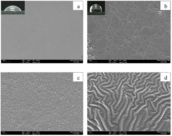 Figure 5a,c depicts the surface structure variations of the borosilicate glass before being treated with the PDMS solution and Figure 5b,d after being treated with the PDMS solution as observed under the FESEM at various magnification scales (1000× and 5000× from top to bottom). The observation in Figure 5b reveals that the chemical treatment with the PDMS solution on the borosilicate glass caused a comprehensive morphological change in the substrate surface compared to its natural structure, as shown in Figure 5a.