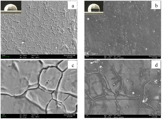 Aside from the roughness factor, any irregularities, or the presence of holes on the surface should be considered when discussing the surface wetness qualities [27]. Figure 6a,c illustrates the FESEM images of untreated stainless steel surfaces at 1000× and 5000× magnification, while Figure 6b,d shows the FESEM imaging of treated stainless steel surfaces with PDMS solutions. Figure 6a depicts the surface of the natural stainless steel before the treatment, with no PDMS solution applied. The surface morphology of the borosilicate glass treated with the PDMS solution was distinguished by the presence of many grooves and curves, which demonstrated significant surface morphology differences compared to the relatively flattened surface of the untreated borosilicate glass. The previous SEM examination of a zinc-coated steel surface with functional silicon revealed the presence of holes that were etched on the sample surface, allowing the microstructure to trap considerable amounts of air and making the surface superhydrophobic [28].