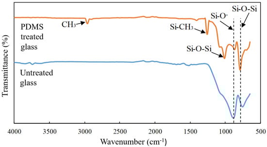 FTIR spectra of the untreated and PDMS-treated borosilicate glass surfaces.
