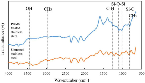 FTIR spectra of the untreated and PDMS-treated stainless steel surfaces.