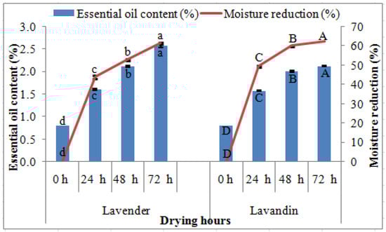 The highest moisture reduction was recorded in 72 h of drying in both Lavandula species because the rate of drying was much faster from 0 to 24 h, but the rate gradually decreased with later drying hours from 24 to 72 h. Similar findings in moisture reduction have been reported in Pistacia lentiscus L. leaves with an increase in drying time []. The highest essential oil content was obtained in 72 h of drying and the findings were in good agreement with findings in Eugenia uniflora L. leaves where higher essential oil content was recorded in later drying of 48 h []. The volatile oil content has been reported to be affected by the drying time, drying method, temperature, and plant species because the moisture level of samples dried for different times can be highly variable and affected essential oil content []. For instance, the highest essential oil content was recorded in 72 h of drying when moisture reduction was maximum (Figure 1) in samples compared to other drying hours. In addition, some important physiological activity (enzymatic reactions) that continue after crop harvest was responsible for the biosynthetic activity of terpenes and resulted in an increase in essential oils content [] reported within the limits as in earlier findings in Lavandula species [,]. A prolonged drying time (up to 8 days) decreased the essential oil content of kaffir lime (Citrus hystrix DC), but shorter drying from zero to four days increased the essential oil content [], which is similar to present findings up to 72 h of drying. The shorter shade drying period (first seven days) increased essential oil content, but decreased with increased drying duration [].