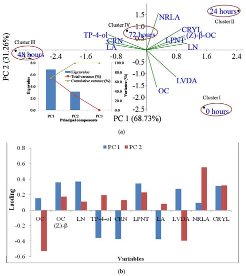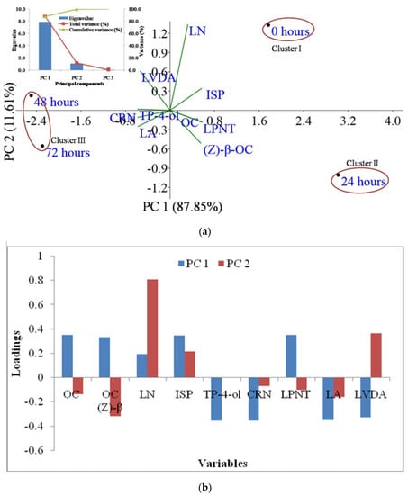 Principal component 1 and principal component 2 jointly explained 99.99% of the total variation for lavender and storage hours; eigenvalues are presented in the scree plot in the bottom left corner of the figure (a), while a loading plot of principal component analysis of lavender and storage hours is presented in figure (b). Note: OC: 3-octanone; OC (Z)-β: (Z)-β-ocimene; LN: linalool; TP-4-ol: terpinen-4-ol; CRN: cryptone; LPNT: linalyl propionate; LA: linalyl acetate; LVDA: lavandulyl acetate; NRLA: neryl acetate; CRYL: caryophyllene.