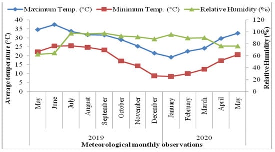 An experiment was executed in 2020 in the CSIR-IHBT (Council of Scientific and Industrial Research, Institute of Himalayan Bioresource Technology), Palampur, Himachal Pradesh (HP), India; situated at an altitude of 1390 m above mean sea level (amsl) (32°11′39″ N latitude and 76°56′51″ E longitude) in a subtropical climate. Weather parameters viz., minimum and maximum temperature (°C), and relative humidity (RH%) during the third year of crop growth are depicted in Figure 4. The minimum temperature ranged from 9 to 26 °C, while the maximum temperature ranged from 19 to 37 °C during the crop harvesting year. Mean relative humidity (%) ranged from 63% to 98% during crop growth.