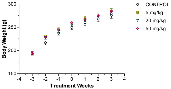 Daily intraperitoneal administration of HON for 3 weeks had no obvious adverse effect on the rats. As illustrated in Figure 2, there were no significant differences among the study groups in terms of age-related increase in body weight. Additionally, the average daily water intake was assessed for each cage and determined to be 19.5 ± 1.5 mL/100 g of body weight (p > 0.05).