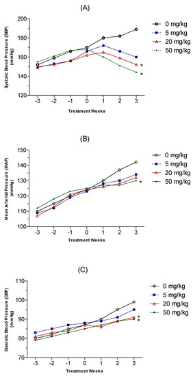 Systolic (SBP), diastolic (DBP), and mean arterial (MAP) blood pressure were measured in conscious, pre-warmed, restrained rats, as previously described [6,12]. For each SHR rat, blood pressure was measured once every week (baseline, Week 1, Week 2, and Week 3) using a non-invasive method based on determining the tail blood volume with a volume-pressure recording sensor and an occlusion tail-cuff (CODA system; Kent Scientific, Torrington, CT, USA). Our previous studies indicate that blood pressure values obtained with the non-invasive tail-cuff method are not significantly different from the values obtained in the same animals by direct measurements in the femoral artery. Blood pressure was measured by multiple readings in individual rats until an average of 15 stable measurements was obtained. Results are shown as the average of blood pressure values obtained from individual rats.