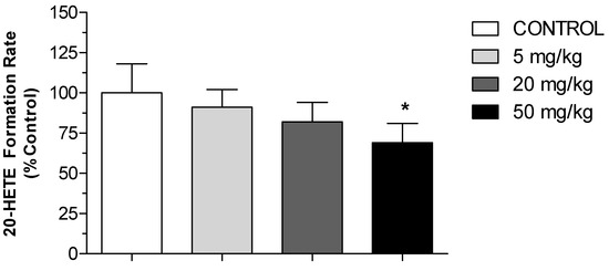 To examine the potential inhibitory effect of short-term daily i.p. administration of HON on the 20-HETE formation rate as a marker for CYP4A activity, 20-HETE was measured in rat renal microsomes after three weeks of exposure to HON at low, medium, and high concentrations using an LC method, as described in the Methods section. Figure 4 illustrates the trend of dose-dependent inhibition of 20-HETE formation. However, a statistically significant reduction in the 20-HETE formation rate was only achieved after the high (50 mg/kg) dose. The formation of 20-HETE was inhibited to 90%, 82%, and 69% of the control value by the low, medium and high doses of HON, respectively (Figure 4).