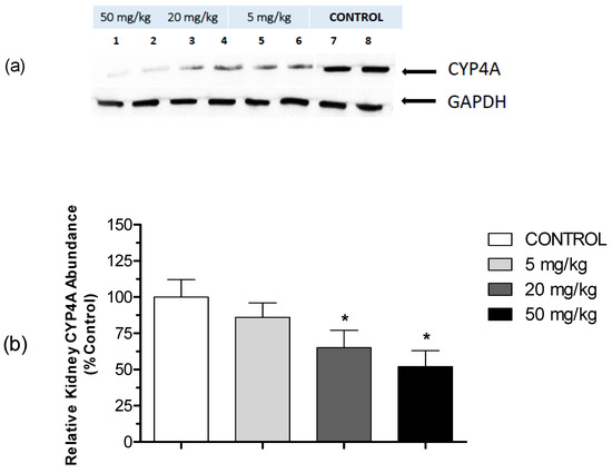 Rat kidney microsomes (10 µg per lane) were incubated at 100 °C for 5 min in Laemmli sample buffer (BioRad, Hercules, CA, USA) and electrophoresed 1 h constant voltage (150 V) through precast polyacrylamide gels (BioRad). Microsomal proteins were then transferred electrophoretically (30 min at 20 V) to PVFD membrane and incubated with CYP4A1/CYP4A2/CYP4A3 rabbit anti-rat polyclonal antibody at a 1:1000 dilution (Lifespan Biosciences) overnight at 4 °C. After washes with PBST, the secondary antibody (goat anti-rabbit conjugated to horseradish peroxidase, Thermo Scientific, Waltham, MA, USA) was added at a 1:5000 dilution for 1 h at room temperature. The immunoreactive proteins were detected via enhanced chemiluminescence and X-ray film imaging, and the resultant signals were analyzed by densitometry (Bio-Rad). The intensity of the band was normalized to GADPH signal, which was used as loading control.