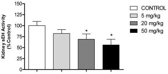 To investigate the potential inhibitory effect of HON on the activity of sEH, an enzyme that hydrolyzes the cardioprotective effect of eicosanoids to inactive diols, we measured the activity of this enzyme in kidney cytosolic fractions from control and HON-treated SHR. The results shown in Figure 6 indicate that the sEH activity was inhibited by 30% and 44% (p < 0.05) following administration of medium (20 mg/kg) and high (50 mg/kg) doses of HON, respectively. Administration of the low dose (5 mg/kg), on the other hand, did not result in significant inhibition of sEH activity.