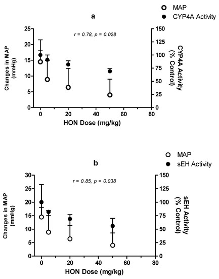 Due to the absence of CYP4A or sEH knockout models for SHR, establishing a cause–effect relationship between the observed effect of HON on MAP, CYP4A activity, and sEH activity was not possible with the present study. Therefore, we investigated the correlation between these variables. When HON-dependent changes in MAP were compared to changes in the 20-HETE formation rate as a measure by CYP4A activity, a good correlation was observed (Pearson r = 0.78 and p = 0.028). While the 5 mg/kg, 20 mg/kg and 40 mg/kg HON doses reduced MAP by approximately 5, 8, and 10.5 mmHg, respectively, the 20-HETE formation rate was reduced by 9, 18, and 31%, respectively (Figure 7). Similarly, changes in MAP reasonably correlated (Pearson r = 0.85 and p = 0.038) with changes in sEH activity in a HON-dose-dependent manner. Namely, compared to the 5, 8, and 10.5 mmHg reductions in MAP, sEH activity was reduced by 12, 31, and 44% following the administration of 5 mg/kg, 20 mg/kg, and 40 mg/kg doses of HON, respectively (Figure 7).